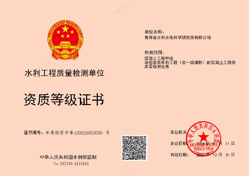 水利工程質(zhì)量檢測單位資質(zhì)等級證書(混凝土工程類) -